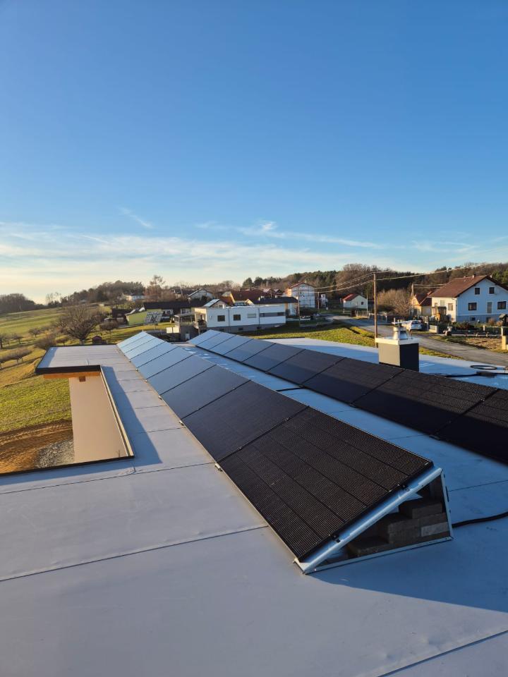 Wir haben ein eigenes System, welches wir nutzen um PV auf einem Flachdach aufzubauen. Es ist relativ einfach und daher kosteneffizient und wird mit Steinen beschwert. Es sind Metallständer die man im perfekten Winkel biegen lassen kann. Idealerweise in Kombination mit einer PV mit Speicher von solpecu.